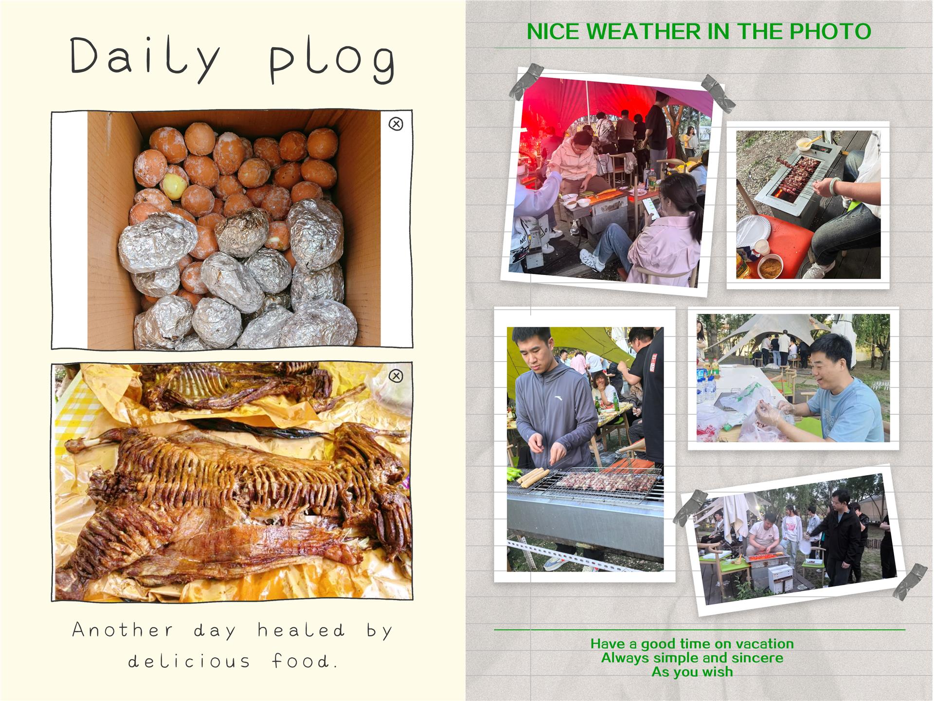 本次活動的重頭戲無疑是令人垂涎的烤全羊!當(dāng)烤制完成的整羊被隆重抬出,現(xiàn)場響起一片歡呼。大家有序排隊(duì),分享這外焦里嫩、鮮美多汁的美味,大快朵頤間,工作的疲憊一掃而空,臉上洋溢著滿足的笑容。與此同時(shí),各部門的”串串兒能手”“燒烤大師”們也紛紛在各自的烤爐前大顯身手,烤制各類肉串、蔬菜等,煙火氣中傳遞著分享的樂趣。